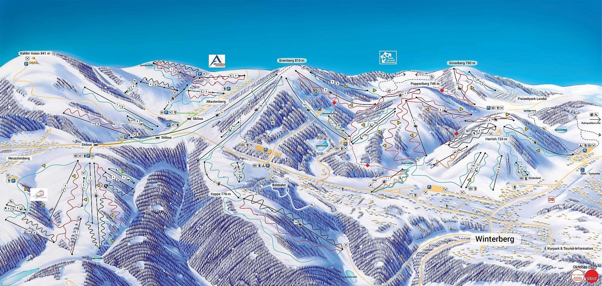 Insgesamt verfügt Winterberg über 83 Abfahrten in zehn Skigebieten mit 60 Liften und einer gemeinsamen Streckenlänge von rund 50 Kilometern Piste.
