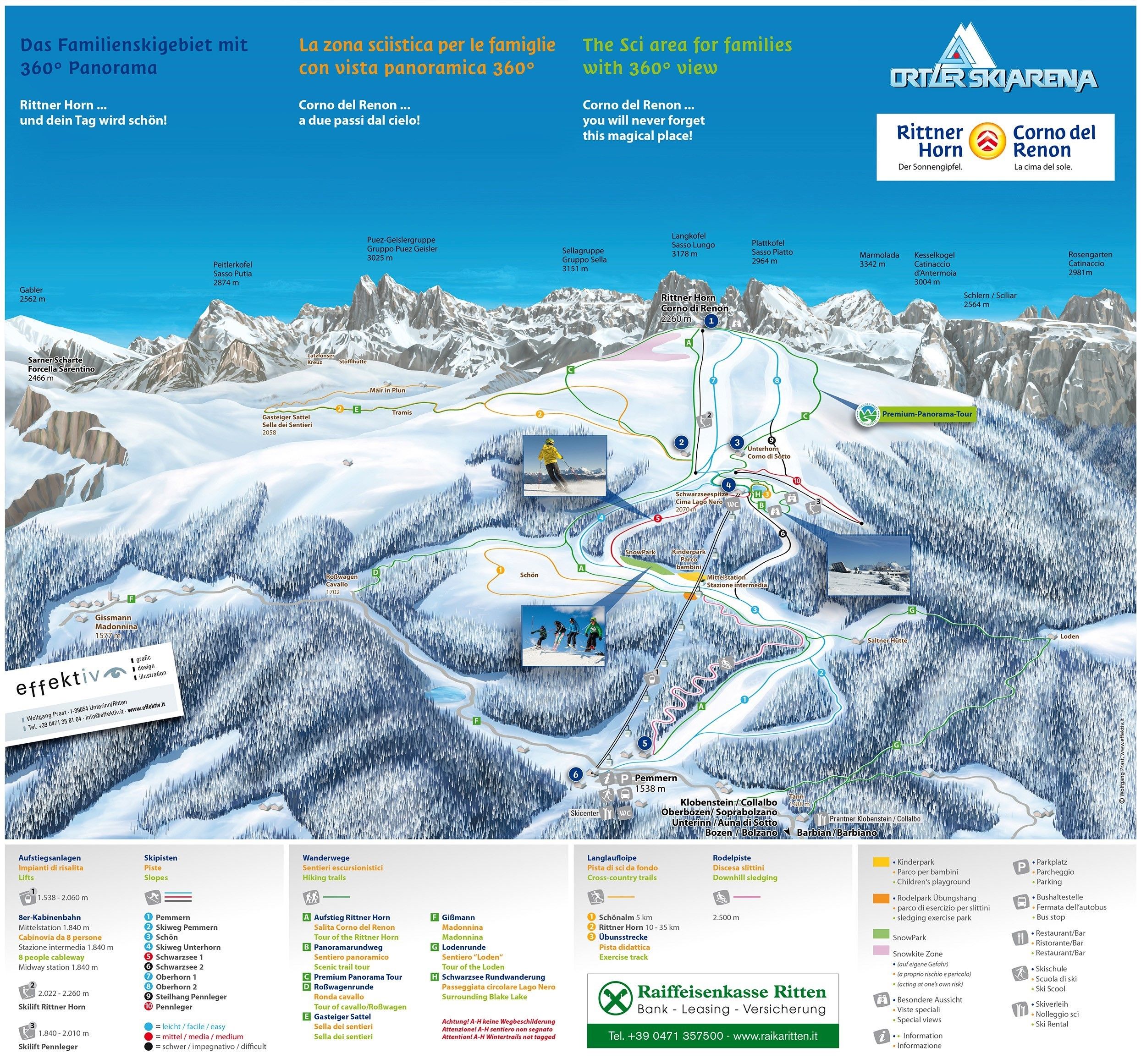 Ein kleines aber sehr schönes Skigebiet liegt direkt in Bozen, nämlich das Rittner Horn. Drei moderne Liftanlagen bringen die Winterurlauber zu den Pisten hinauf, die zusammen gerade einmal 14 Kilometer Länge haben. Was klein klingt, ist durch die wunderschöne Lage und die entspannte Atmosphäre jedoch ein echter Geheimtipp für Skiurlaub Italien. Am Rittner Horn müssen Sie im Skiurlaub keine überlaufenen Pisten fürchten, sondern können Ihre Urlaubstage in aller Ruhe genießen. Auf den einfachen Abfahrten von sieben Kilometern Länge ist viel Platz, um die ersten Skierfahrungen zu sammeln und sich langsam an eine neue Sportart heranzutasten. Erfahrene Skifahrer wagen sich auf die vier Kilometer mittelschwere Pisten und finden dort die eine oder andere Herausforderung bei der Abfahrt. Eine wirkliche Herausforderung sind jedoch die drei Kilometer schwarze Pisten. Sie erfordern Geschick und sorgen für einen echten Adrenalinkick. Das ganze Skigebiet Rittner Horn können Sie mit dem Skipass nutzen. Er erlaubt die Benutzung der Lifte und der Pisten und kann meistens direkt im Hotel erworben werden, in dem Sie während Ihres Skiurlaubs in Bozen übernachten. Sie können jedoch auch mit einem Skipass für die Skiregion Dolomiti Superski ein riesiges Gebiet für Ihre Abfahrten nutzen, das mehr als 1.200 Kilometer Piste, ganze 450 Lifte und jede Menge Skispaß zu bieten hat. In der Skiregion Dolomiti Superski sind insgesamt zwölf unterschiedliche Skigebiete zusammengefasst, die sich in den Dolomiten und damit in der Nähe von Ihrem Winterurlaubsort Bozen befinden.