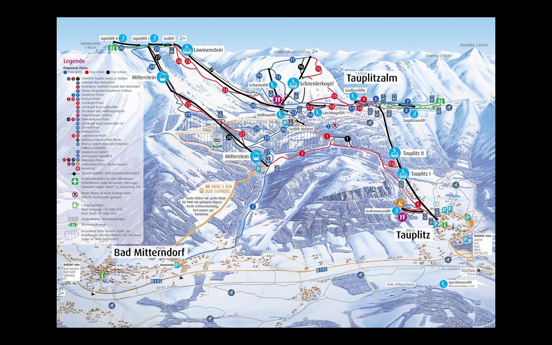Die Skiregion Bad Mitterndorf ist 60 Hektar groß und verfügt über 42 Pistenkilometer, die direkt in das Tal der Gemeinde führen. Jeweils 18 Kilometer entfallen auf leichte und mittelschwere Pisten, die sich für Anfänger und Fortgeschrittene eignen. Wenn Sie in Ihrem Skiurlaub in Bad Mitterndorf die Herausforderung suchen und Ihr Können unter Beweis stellen möchten, dann können Sie etwa sechs Kilometer schwarze Pisten für Ihre Abfahrten nutzen. Damit auch Anfänger den Spaß am Skifahren oder Snowboarden für sich entdecken können, befinden sich verschiedene Skischulen in der Gemeinde. Sie bieten Kurse für Anfänger und erklären die Techniken des Skifahrens von Grund auf. Einige dieser Angebote richten sich speziell an Kinder, die zum ersten Mal in einem Winterurlaub auf Skiern stehen möchten. Fahren Sie lieber durch Tiefschnee und abseits der Pisten? Dann sind Sie in Bad Mitterndorf genau richtig. In Ihrem Skiurlaub können Sie zahlreiche Tiefschneeregionen erkunden und mit Ihren Skiern oder dem Snowboard diesen ganz besonderen Spaß beim Wintersport erleben. Auch ein Freeridegelände ist hier zu finden und lädt Skifahrer und vor allem Snowboarder zu gewagten Sprüngen ein.