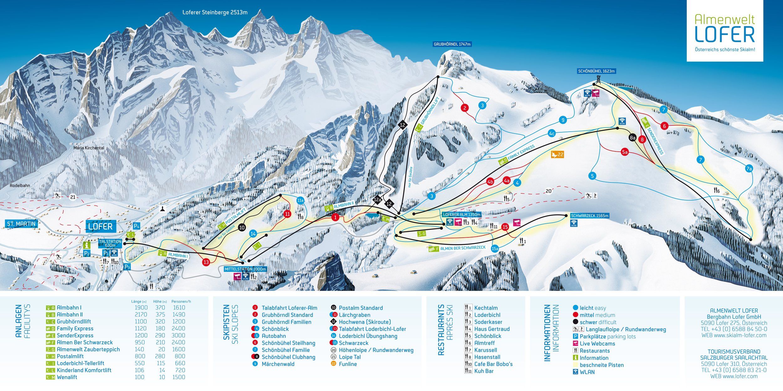 Das Skigebiet Lofer ist ein kleines, aber feines Skigebiet mit knapp 50 km hervorragend gepflegter Pisten, Hänge und Abfahrten. 10 Lifte und Seilbahnen sorgen für einen reibungslosen Ablauf. Dank vielen sanften und nicht allzu steilen Pisten haben es Anfänger hier leicht, ihr Können zu erproben und zu verbessern. Das Skigebiet Lofer zeichnet sich durch seine Schneesicherheit, seine Familienfreundlichkeit und preiswerte Preise aus. Einen Besuch der Almenwelt Lofer, eine von Österreichs schönsten Skialmen mit 30 Almhütten, sollte man sich nicht entgehen lassen. Seit der Wintersaison 2012/2013 wurde die Almenwelt Lofer mit Schwarzeck zudem um ein zusätzliches Skigebiet erweitert. Mit dem Almer 8er, einem der modernsten Sessellifte, können die Skifahrer, Snowboarder und Langläufer jetzt noch mehr Pisten für sich erschließen und einen außergewöhnlichen Panoramablick über die verschneite Winterlandschaft genießen. Zahlreiche Langlaufloipen und Winterwanderwege in und um Lofer laden ebenfalls zum Erkunden und Genießen der Bergwelt ein.
