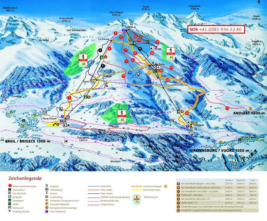 Mit drei Sesselliften gelangen Sie im Skiurlaub von Brigels aus direkt in das angrenzende Skigebiet. Zu diesem Skigebiet gehören 75 Kilometer Pisten in jeder Schwierigkeit. Den Großteil machen mit 44 Kilometern Länge die mittelschweren Pisten im Skigebiet Brigels – Waltensburg – Andiast aus. Anfänger und auch junge Gäste im Winterurlaub in Brigels können insgesamt 21 Kilometer einfache Pisten nutzen und Profis toben sich auf zehn Kilometern schwarze Pisten aus. Neben den Pisten für Abfahrten finden Sie im Skiurlaub auch Loipen für den Langlauf rund um Brigels, Wanderwege, die speziell für den Winter angelegt wurden, Rodelpisten und einige andere Freizeitangebote. Das passende Hotel oder eine schöne Unterkunft für den Skiurlaub in Brigels buchen Sie hier bei uns zum attraktiven Urlaubspreis und auf Wunsch in Kombination mit einem Skipass für das angrenzende Skigebiet!