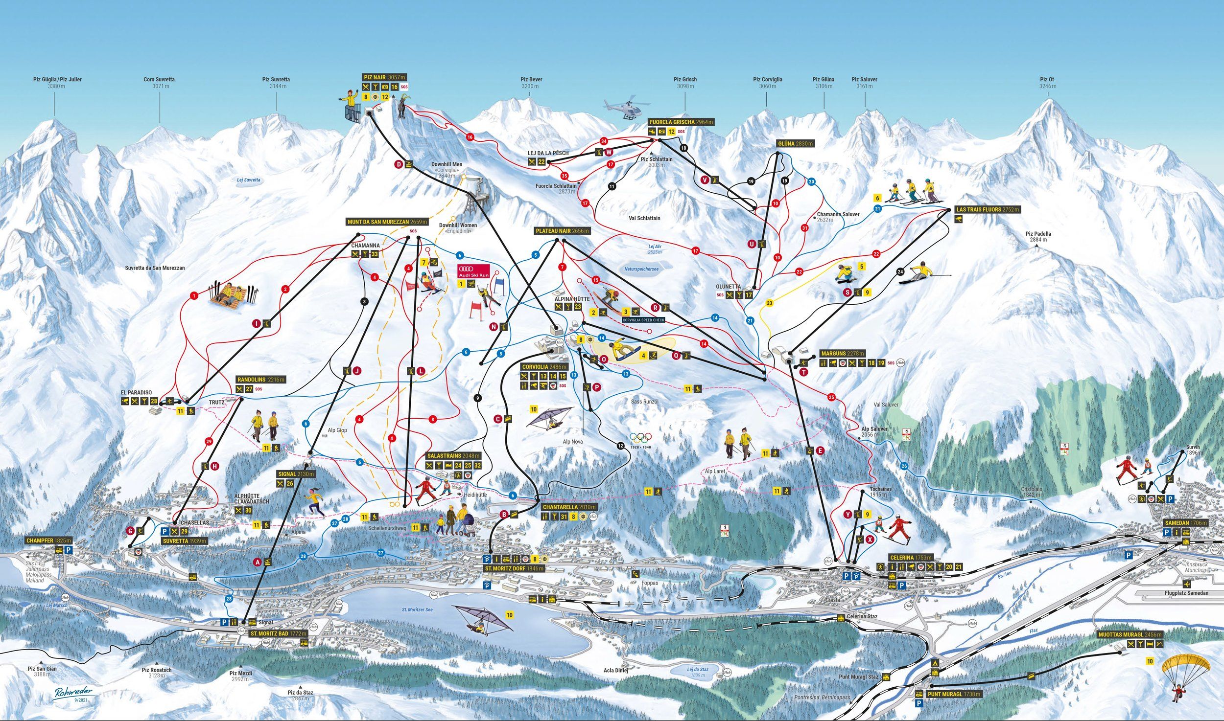 Direkt an St. Moritz angeschlossen ist das Skigebiet Corviglia-Marguns-Piz Nair, das mit seinen rund 350 Pistenkilometern das größte zusammenhängende Skigebiet der Schweiz bildet. Über 25 Pisten mit unterschiedlichen Schwierigkeitsgraden, viele moderne Liftanlagen, ausgezeichnete Langlaufloipen und idyllische Winterwanderwege sorgen für ein unvergleichliches Wintersporterlebnis, bei dem sowohl Skifahrer und Snowboarder als auch Langläufer und Wanderer voll auf ihre Kosten kommen. Das Skigebiet erstreckt sich über eine Höhe von 1800 bis 3300 m und verfügt daher mit Sicherheit immer über genügend Schnee. Corvatsch und Diavolezza sind weitere Skigebiete, die von St. Moritz aus zu erreichen sind. Ein besonderes Highlight ist hier die längste gesicherte Gletscherabfahrt der Schweiz nach Morteratsch mit ganzen 10 km Länge.